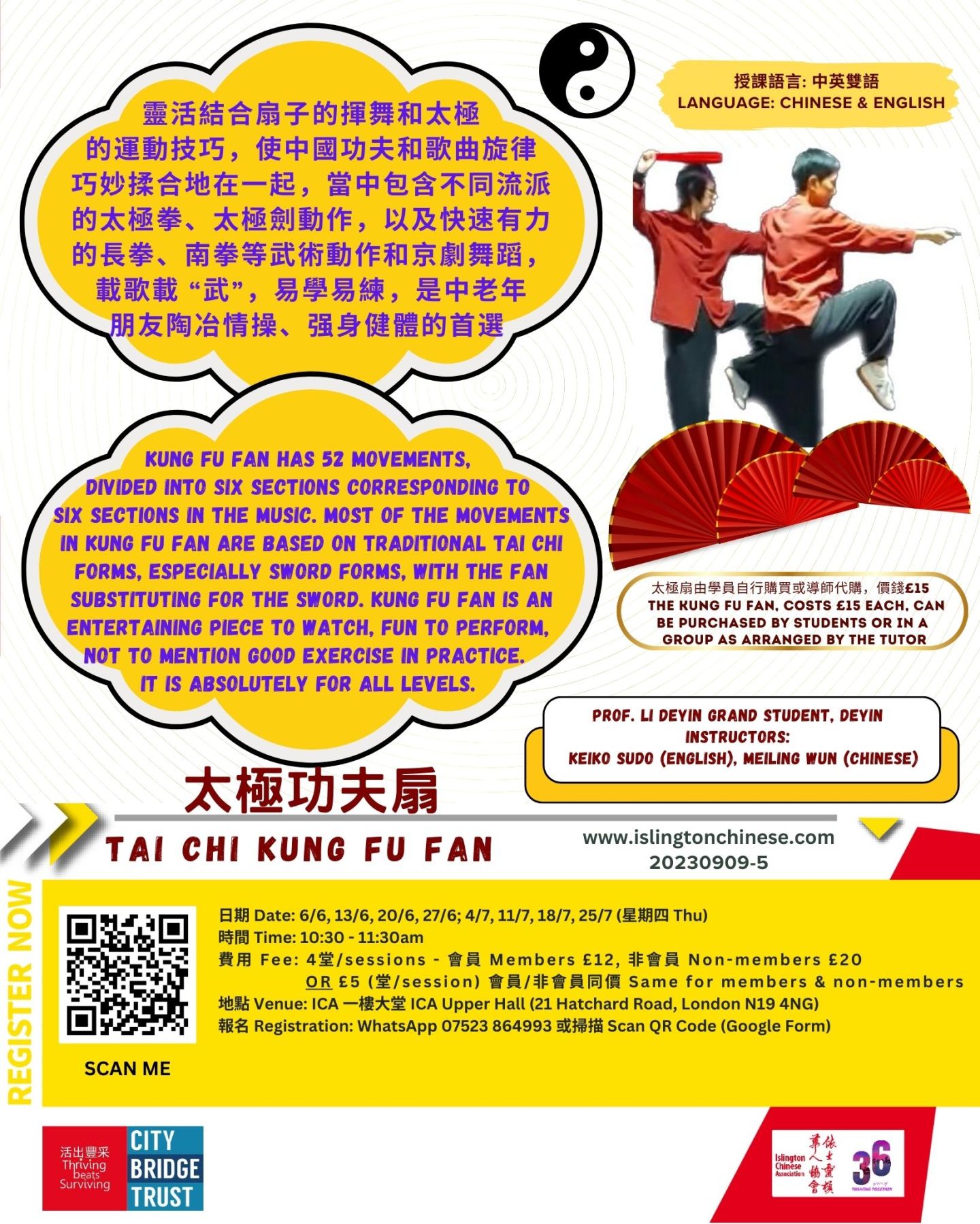 費用 Fee :4堂/sessions – 會員 Members £12, 非會員 Non-members £20 (按月繳費 / Pay Monthly); OR £5 (堂/session) 會員/非會員同價 same for members & non-members