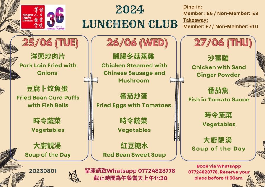 下星期菜單準備好了!當天上午11:30前記得 WhatsApp 07724 828778 留位啦! The latest Lunch Menu is ready! Remember to WhatsApp 07724 828778 and reserve your seat before 11:30 am on the day.