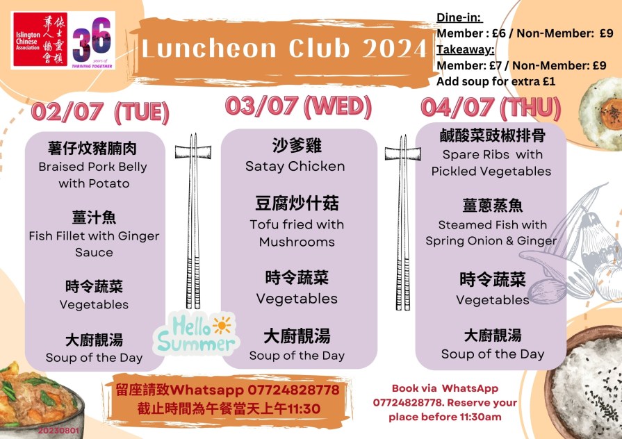 下星期菜單準備好了!當天上午11:30前記得 WhatsApp 07724 828778 留位啦! The latest Lunch Menu is ready! Remember to WhatsApp 07724 828778 and reserve your seat before 11:30 am on the day.