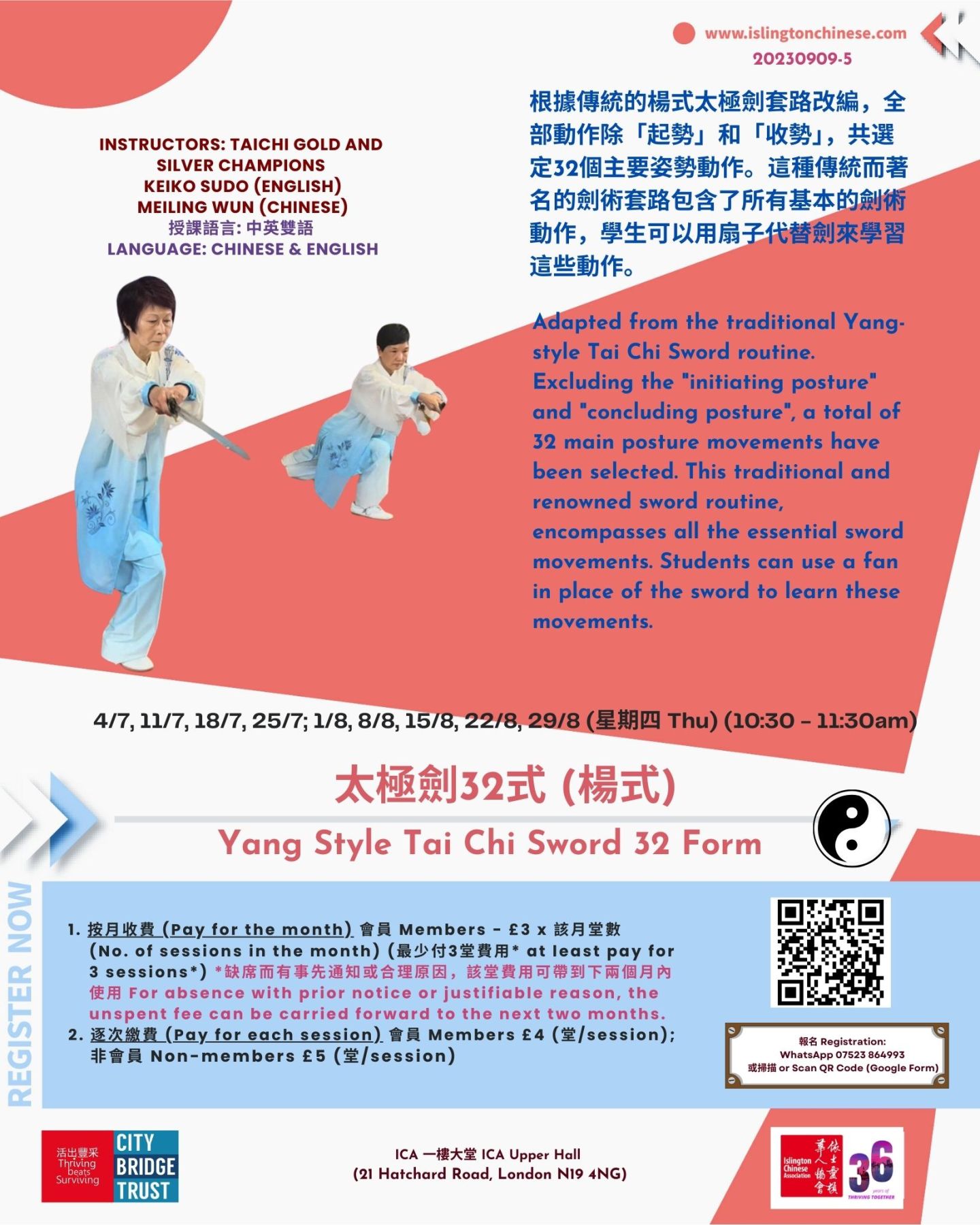 費用 Fee :1. 按月收費 (Pay for the month) 會員 Members – £3 x 該月堂數 (No. of sessions in the month) (最少付3堂費用* at least pay for 3 sessions*) *缺席而有事先通知或合理原因,該堂費用可帶到下兩個月內使用 For absence with prior notice or justifiable reason, the unspent fee can be carried forward to the next two months. 2. 逐次繳費 (Pay for each session) 會員 Members £4 (堂/session); 非會員 Non-members £5 (堂/session)