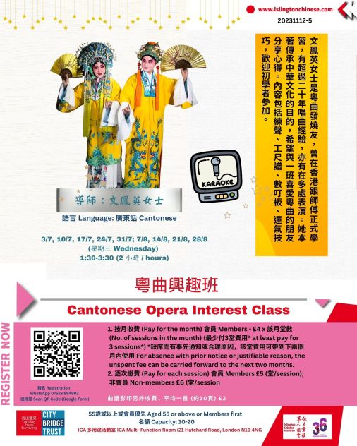 費用 Fee: 1. 按月收費 (Pay for the month) 會員 Members – £4 x 該月堂數 (No. of sessions in the month) (最少付3堂費用* at least pay for 3 sessions*) *缺席而有事先通知或合理原因,該堂費用可帶到下兩個月內使用 For absence with prior notice or justifiable reason, the unspent fee can be carried forward to the next two months. 2. 逐次繳費 (Pay for each session) 會員 Members £5 (堂/session); 非會員 Non-members £6 (堂/session) 曲譜影印另外收費,平均一首 (約10頁) £2