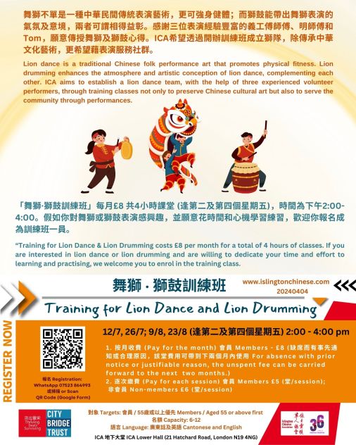 「舞獅·獅鼓訓練班」每月£8 共4小時課堂 (逢第二及第四個星期五),時間為下午2:00-4:00。假如你對舞獅或獅鼓表演感興趣,並願意花時間和心機學習練習,歡迎你報名成為訓練班一員。