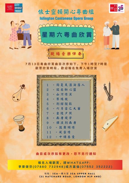 為推廣粵曲及弘揚中華文化,依士靈頓華人協會及「開心粵曲組」於2024年合作開辦「依士靈頓開心粵曲組」。由2024年1月6日起,逢星期六下午1:00至7:00是觀眾免費欣賞粵曲時段,歡迎前來ICA觀賞,報名請WhatsApp 李蔡健芬 (07880 732948) 或 方嘉倫 (07552 352222)。地點:ICA一樓大堂 (21 Hatchard Road, London N19 4NG)。