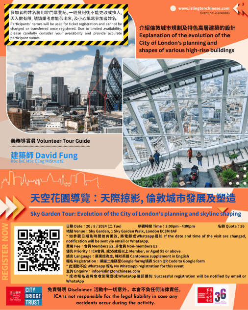 Sky Garden是倫敦最高的公共花園,可以360度觀賞倫敦的景色及視野。我們的義務導賞員將解釋倫敦市的發展和規劃,以及富有特色的高層建築。歡迎來加入我們,享受一個放鬆愉快的下午!