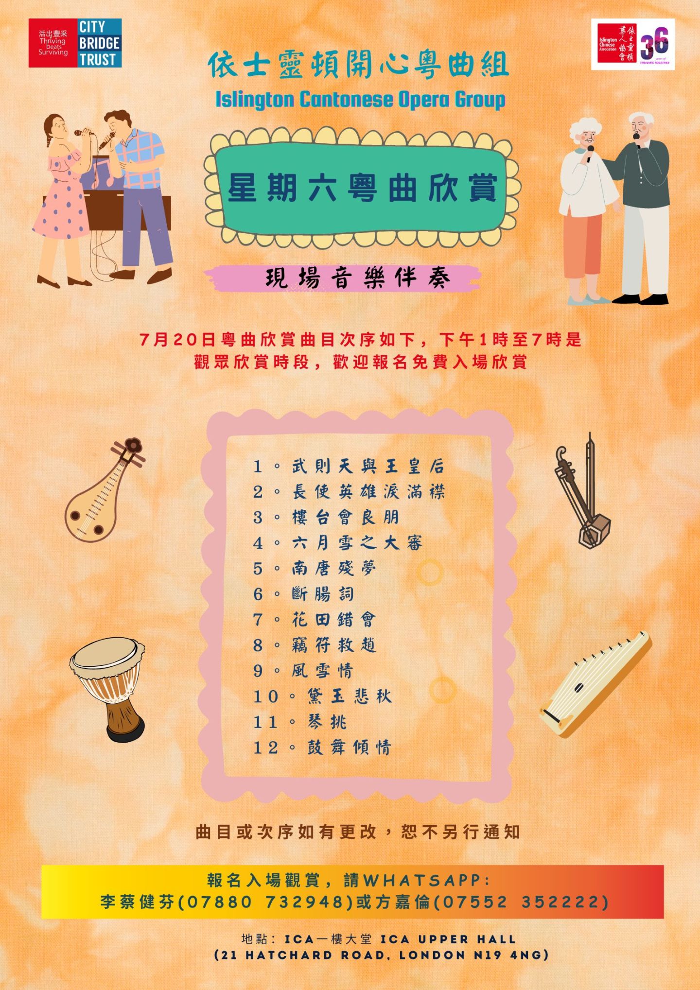 為推廣粵曲及弘揚中華文化,依士靈頓華人協會及「開心粵曲組」於2024年合作開辦「依士靈頓開心粵曲組」。由2024年1月6日起,逢星期六下午1:00至7:00是觀眾免費欣賞粵曲時段,歡迎前來ICA觀賞,報名請WhatsApp 李蔡健芬 (07880 732948) 或 方嘉倫 (07552 352222)。地點:ICA一樓大堂 (21 Hatchard Road, London N19 4NG)。