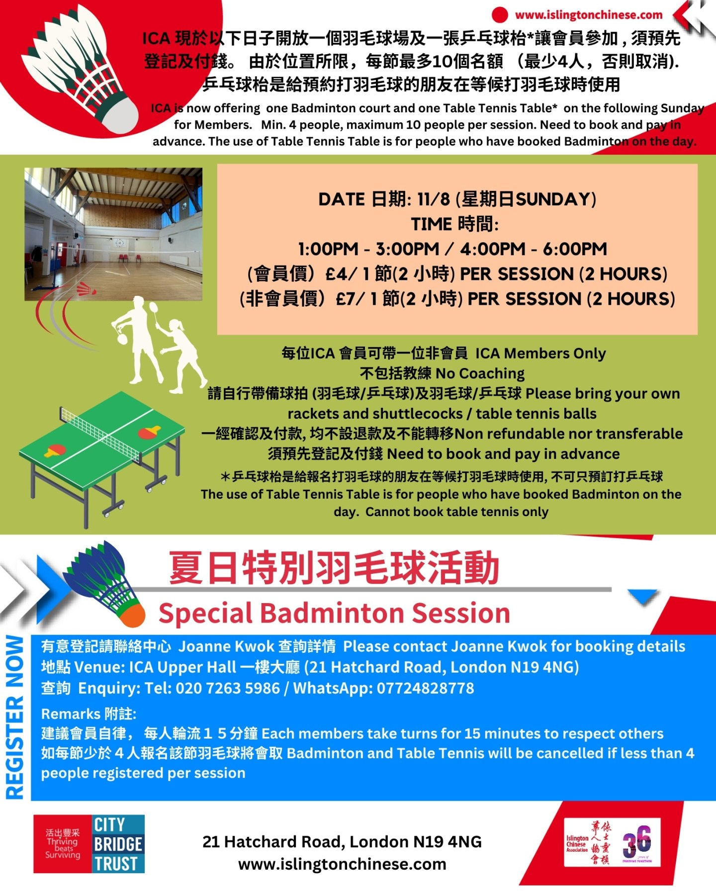 ICA 現於以下日子開放一個羽毛球場及一張乒乓球枱*讓會員參加 , 須預先登記及付錢。 由於位置所限,每節最多10個名額 (最少4人,否則取消). 乒乓球枱是給預約打羽毛球的朋友在等候打羽毛球時使用, 不能單獨登記打乒乓球.