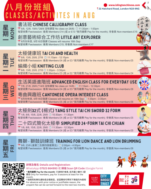 報名 Registration:WhatsApp (07523 864993) 或 親臨協會 或 填寫此 Google Form https://forms.gle/uDfCcbTGPhNk4zgT7 (報名獲接納者,將會收到電郵 或 WhatsApp 確認)。WhatsApp (07523 864993) or fill in this Google Form https://forms.gle/uDfCcbTGPhNk4zgT7 (Those who are accepted will be notified separately by email or WhatsApp.)