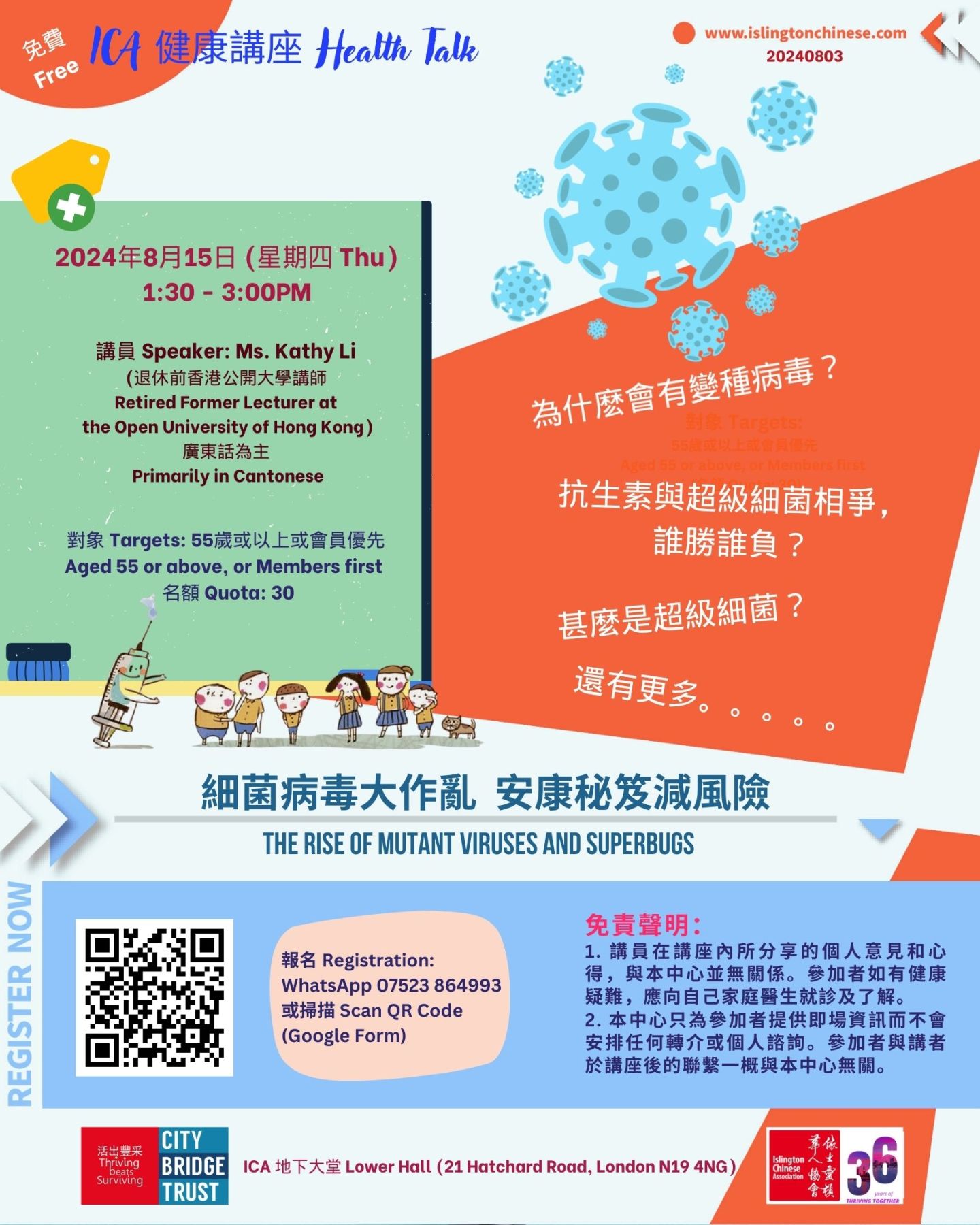 免責聲明 Disclaimer:1. 講員在講座內所分享的個人意見和心得,與本中心並無關係。參加者如有健康疑難,應向自己家庭醫生就診及了解。The speaker’s opinions and insights shared during the talk do not represent the views of ICA. Participants with any health concerns should consult their family doctor for advice and understanding. 2. 本中心只為參加者提供即場資訊而不會安排任何轉介或個人諮詢。參加者與講者於講座後的聯繫一概與本中心無關。ICA only provides on-site information to participants and does not arrange any referrals or personal consultations. Any subsequent contact between participants and the speaker after the lecture is unrelated to this centre.
