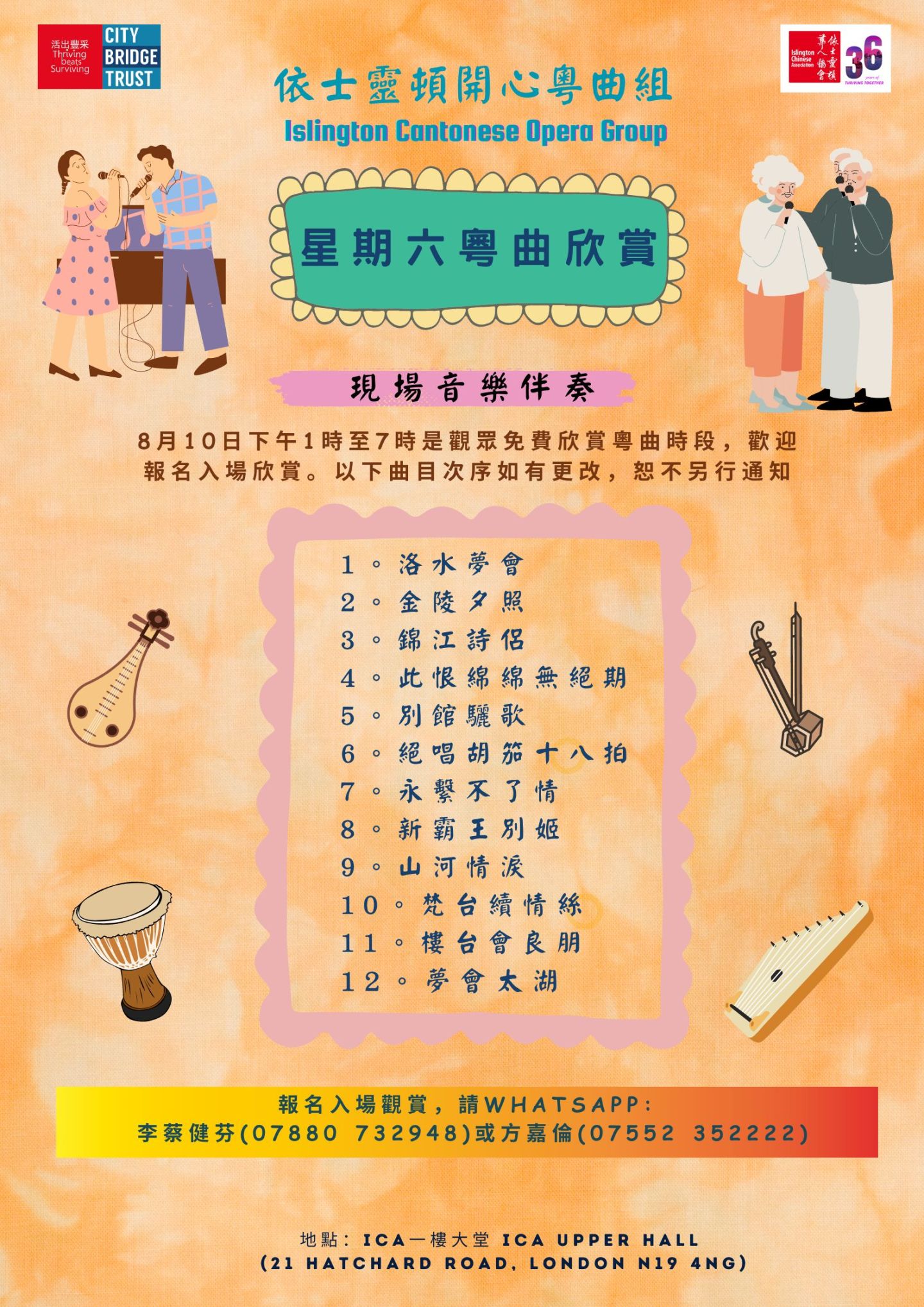 為推廣粵曲及弘揚中華文化,依士靈頓華人協會及「開心粵曲組」於2024年合作開辦「依士靈頓開心粵曲組」。由2024年1月6日起,逢星期六下午1:00至7:00是觀眾免費欣賞粵曲時段,歡迎前來ICA觀賞,報名請WhatsApp 李蔡健芬 (07880 732948) 或 方嘉倫 (07552 352222)。地點:ICA一樓大堂 (21 Hatchard Road, London N19 4NG)。