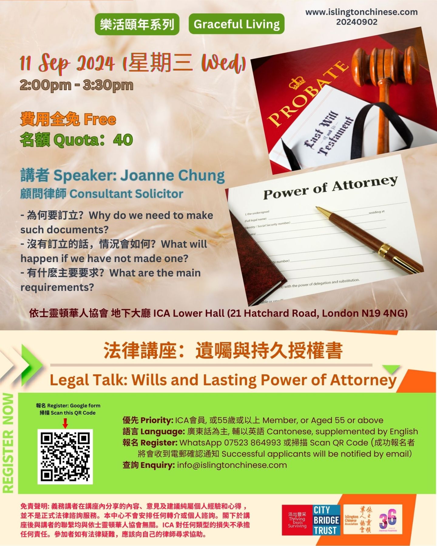 免責聲明 Disclaimer: 義務講者在講座內分享的內容、意見及建議純屬個人經驗和心得 ,並不是正式法律諮詢服務。本中心不會安排任何轉介或個人諮詢。閣下於講座後與講者的聯繫均與依士靈頓華人協會無關。ICA 對任何類型的損失不承擔任何責任。參加者如有法律疑難,應該向自己的律師尋求協助。The information, experiences, insights and opinions provided by the voluntary speaker are based on his/her perspectives and solely for informational purposes only and should not be considered as part of a legal consultation service or address the participant’s legal requirements. The Islington Chinese Association (ICA) does not provide legal consultation referrals. If a participant wishes to make contact with the speaker after the talk, it is completely at the participant’s risk. ICA is not liable for any damages of any kind.