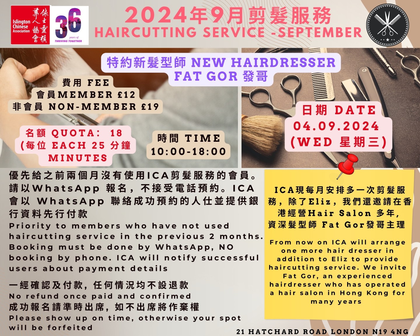 資深髮型師 Fat Gor發哥9月4日(星期三) 到中心負責剪髮服務. 剪髮服務由早上10時至下午6時(最後預訂時間為下午5時20分 , 名額18名, 每位25分鐘). 我們會優先給之前兩個月沒有使用ICA剪髮服務的朋友。請以WhatsApp 報名 (T: 07724828778),不接受電話預約。ICA 會以 WhatsApp 聯絡成功預約的人仕並提供銀行資料先行付款(會員£12,非會員£19).