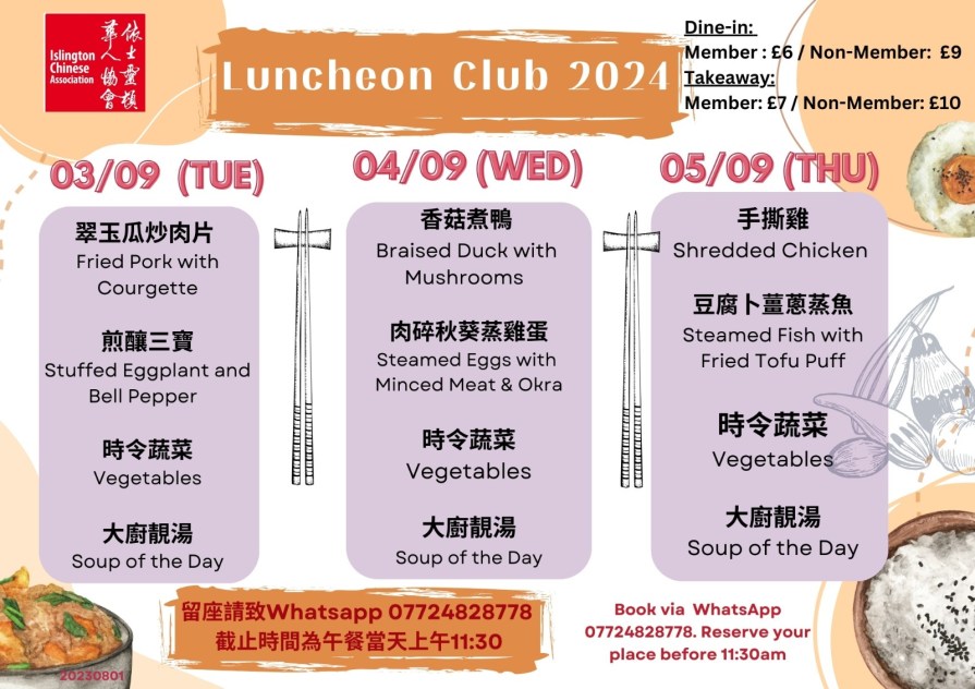 下星期菜單準備好了!當天上午11:30前記得 WhatsApp 07724 828778 留位啦! The latest Lunch Menu is ready! Remember to WhatsApp 07724 828778 and reserve your seat before 11:30 am on the day.