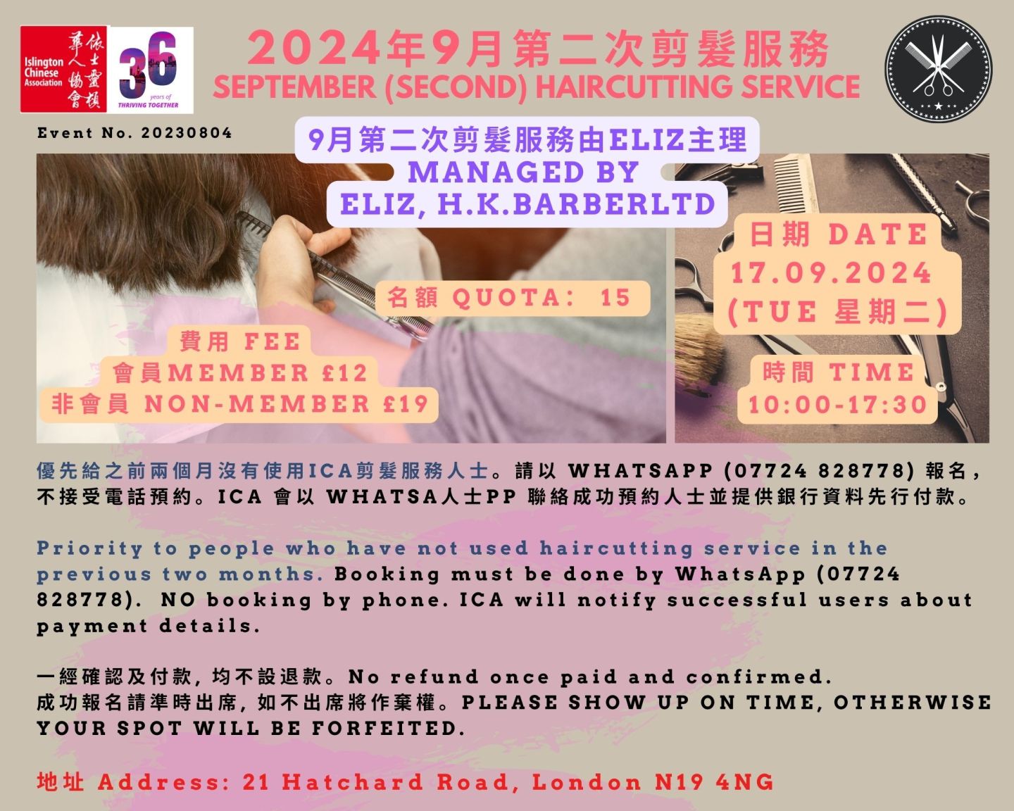 ICA 9月第二次剪髮服務將於9月17日 (星期二) 由Eliz主理 , 剪髮服務由早上10時至下午5時30 (最後預訂時間為下午5時)。我們會優先給之前兩個月沒有使用ICA剪髮服務的人士。請以 WhatsApp (07724 828778) 報名,不接受電話預約。ICA 會以 WhatsApp 聯絡成功預約的人士並提供銀行資料先行付款(會員£12,非會員£19)。