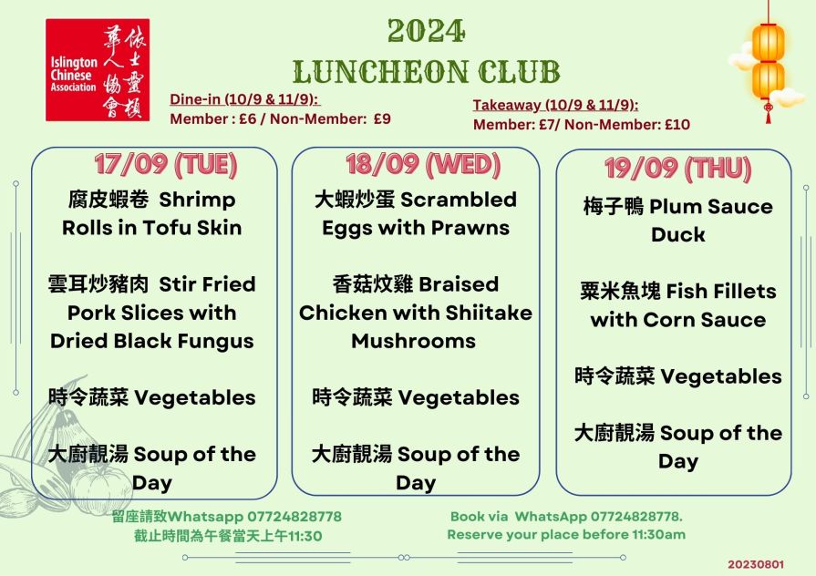 下星期菜單準備好了!當天上午11:30前記得 WhatsApp 07724 828778 留位啦! The latest Lunch Menu is ready! Remember to WhatsApp 07724 828778 and reserve your seat before 11:30 am on the day.