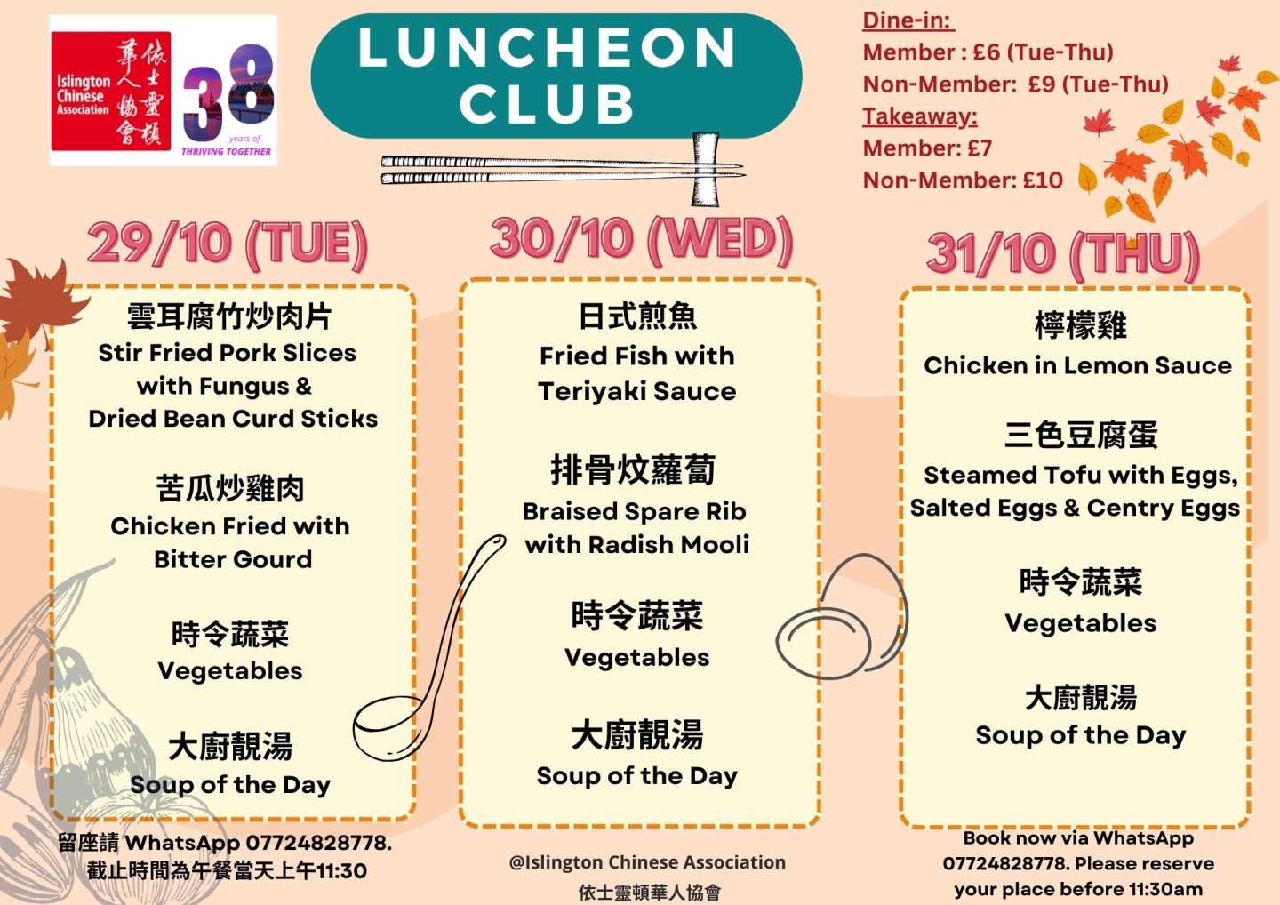 下星期菜單準備好了!當天上午11:30前記得 WhatsApp 07724 828778 留位啦 .