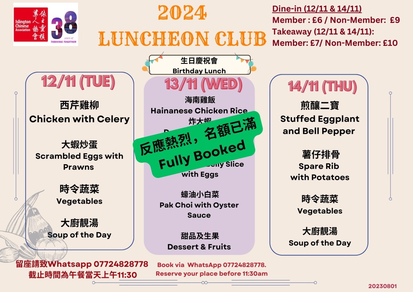 下星期菜單準備好了!當天上午11:30前記得 WhatsApp 07724 828778 留位啦 .