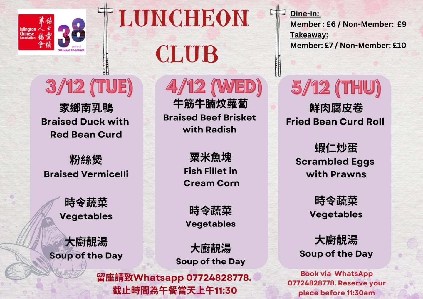 下星期菜單準備好了!當天上午11:30前記得 WhatsApp 07724 828778 留位啦 .