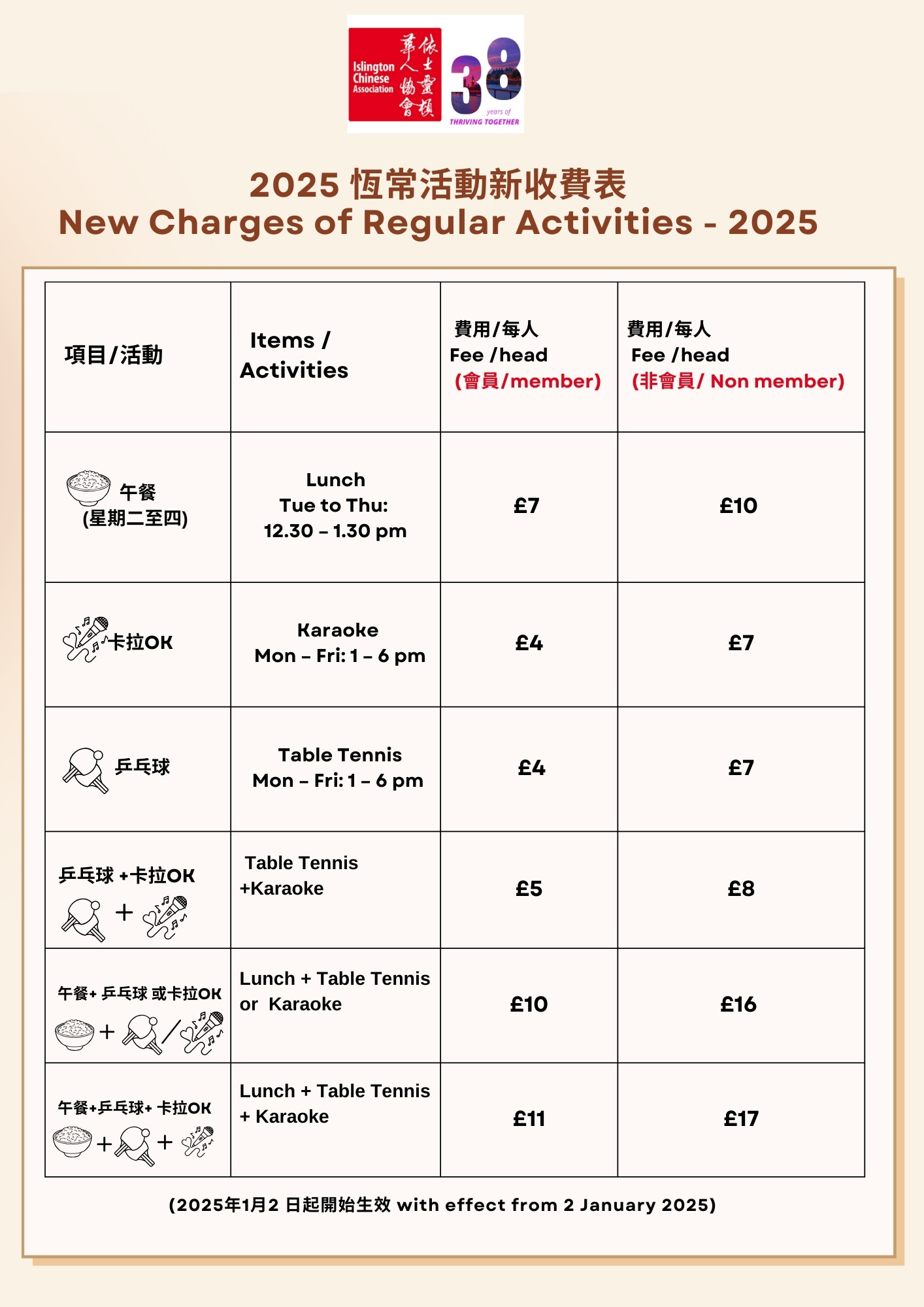 Due to increasing operating cost, we will start new charges of various Regular Activities (Luncheon Club, Table Tennis and Karaoke) with effect from 2 Jan 2025. Please find attached photo for details. At the same time, we will launch two SPECIAL Combo. The first combo is Lunch + Table Tennis Or Karaoke (Member £10 / Non Member £16) and another combo is Lunch + Table Tennis + Karaoke (Member £11 / Non Member £17). Thank you for your continuous support to ICA.