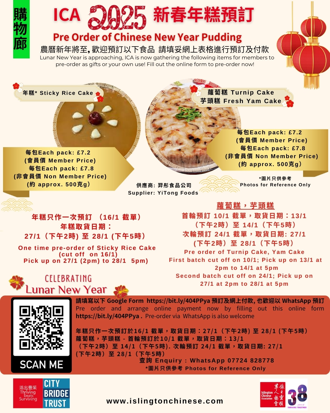 農曆新年將至, 依士靈頓華人協會 (ICA)準備以下食品給 2025 ICA 會員預訂! 請填妥網上表格進行預訂及付款.也歡迎以 WhatsApp 07724828 778 預訂.