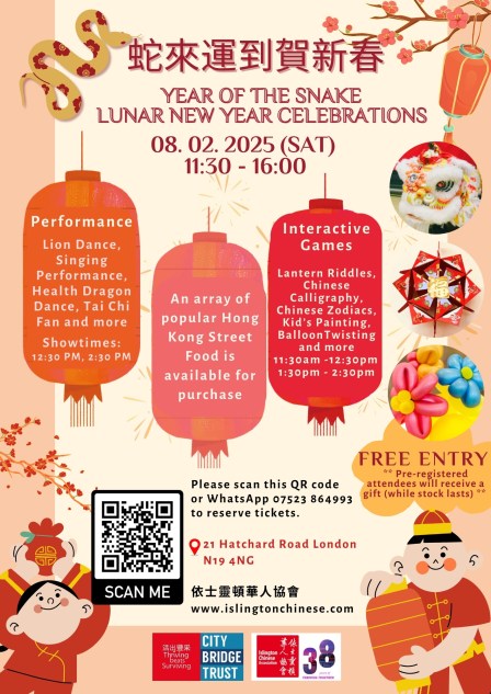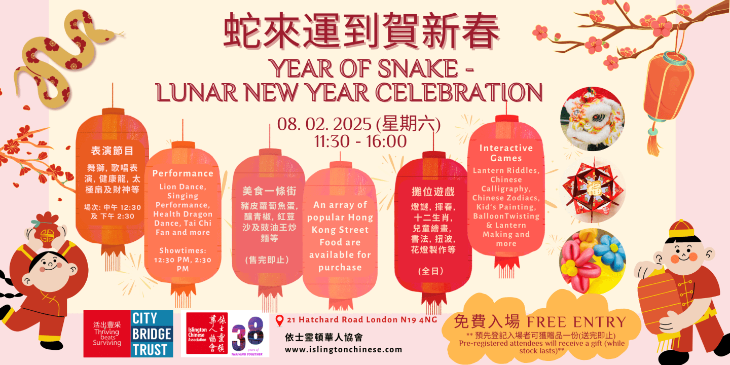 『蛇來運到 – 新春嘉年華』將於2025年2月8日 (星期六)在依士靈頓華人協會(ICA)舉行 (11:30am – 4:00pm), 與大家共賀蛇年。當日節目豐富,包括:Year of the Snake – Lunar New Year Celebrations will be held on 8 February at the Islington Chinese Association. Programmes include: