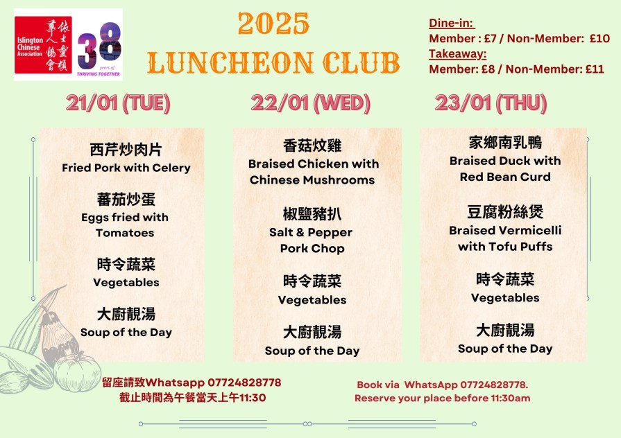下星期菜單準備好了!當天上午11:30前記得 WhatsApp 07724 828778 留位啦 .
