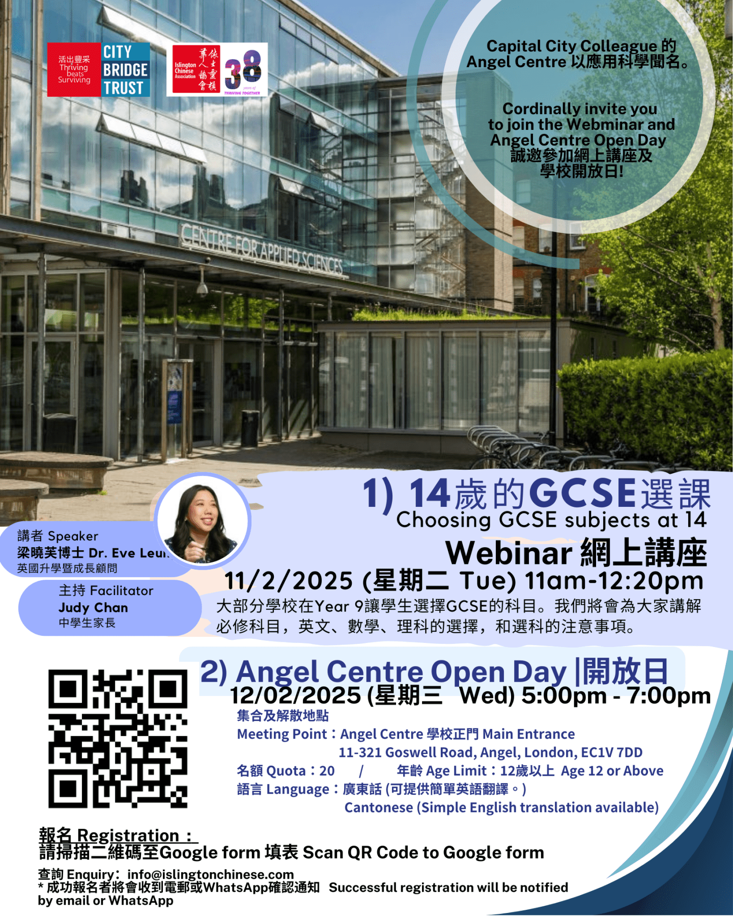 免責聲明 Disclaimer: 義務講者在講座內分享的內容、意見及建議純屬個人經驗和心得 ,並不是正式教育諮詢服務。本中心不會安排任何轉介或個人諮詢。閣下於講座後與講者的聯繫均與依士靈頓華人協會無關。ICA 對任何類型的損失不承擔任何責任。參加者如有升學疑難,應該向專業顧問尋求協助。The information, experiences, insights and opinions provided by the voluntary speaker are based on his/her perspectives and solely for informational purposes only and should not be considered as part of an education consultation service or address the participant’s education requirements. The Islington Chinese Association (ICA) does not provide education consultation referrals. If a participant wishes to make contact with the speaker after the talk, it is completely at the participant’s risk. ICA is not liable for any damages of any kind.