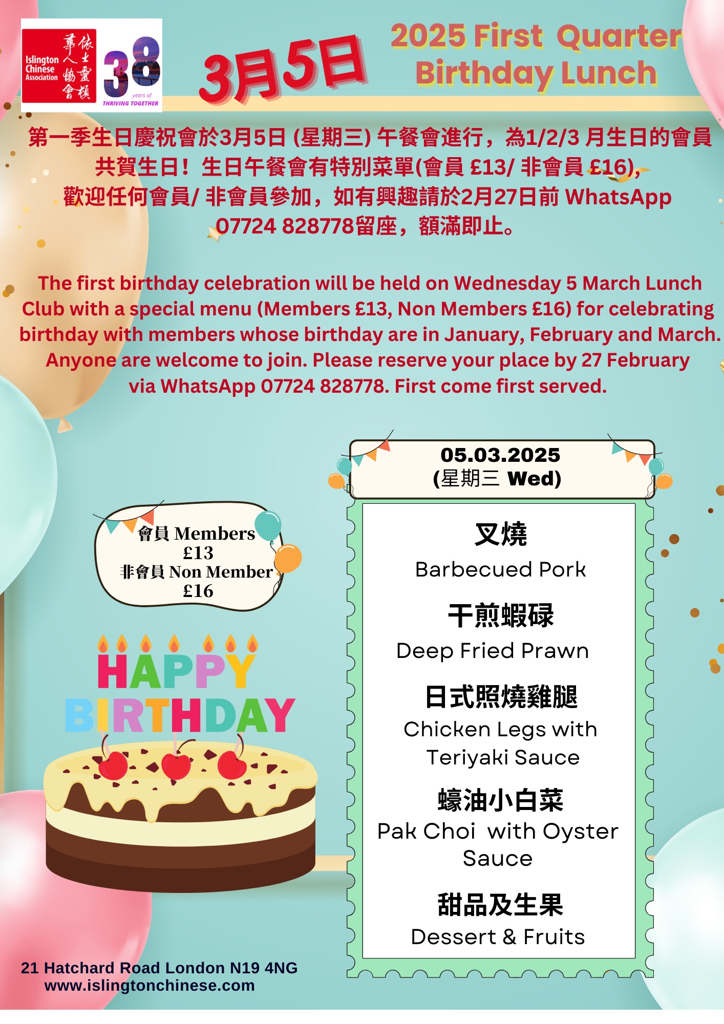 第一季生日慶祝會於3月5日 (星期三) 午餐會進行,為1/2/3 月生日的會員共賀生日!生日午餐會有特別菜單(會員 £13/ 非會員 £16), 歡迎任何會員/ 非會員參加,如有興趣請於2月27日前 WhatsApp 07724 828778 留座,額滿即止。