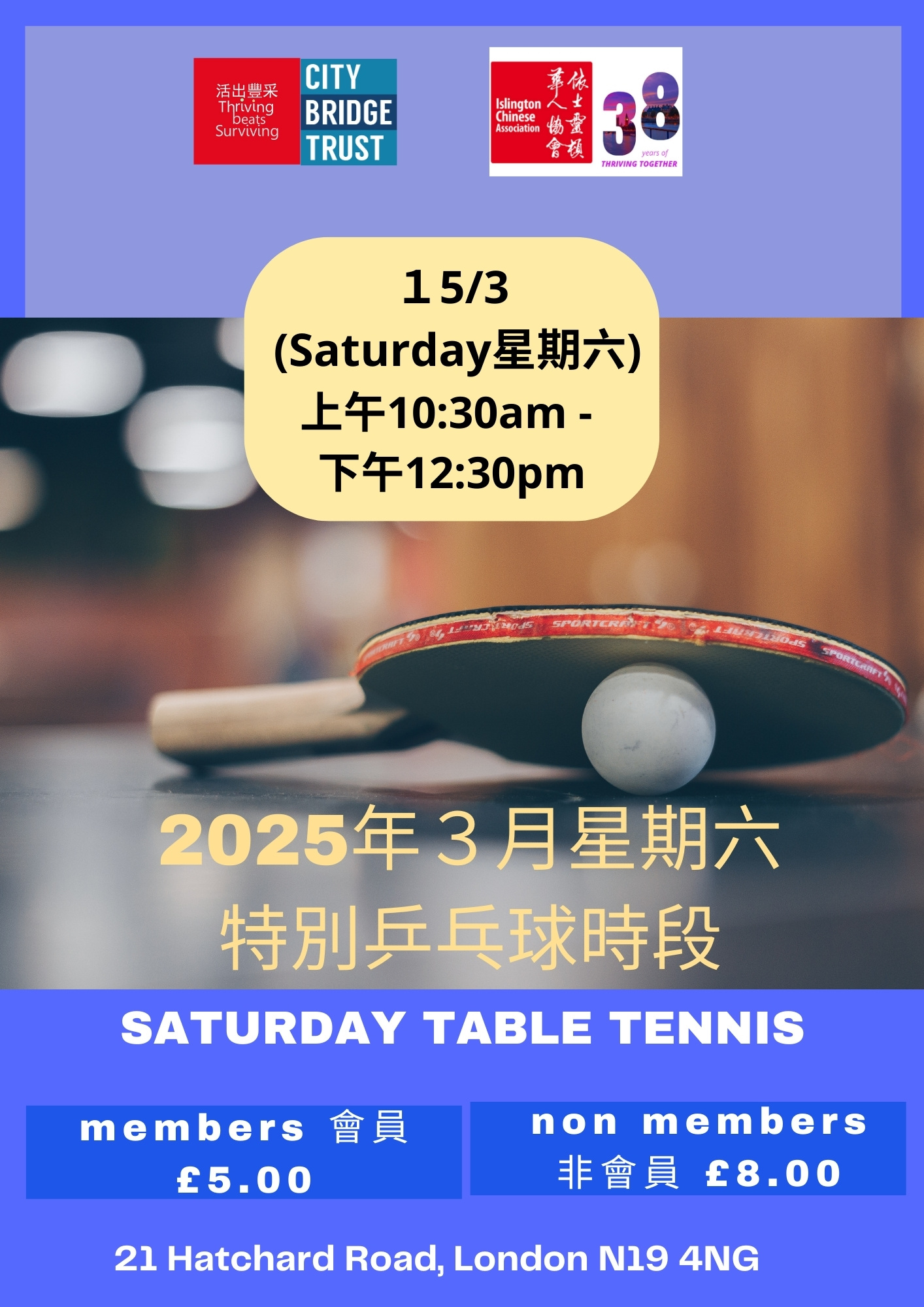 3月15日星期六ICA 安排週六特別乒乓球時段, 早上10時半至中午12時半, 到時見.