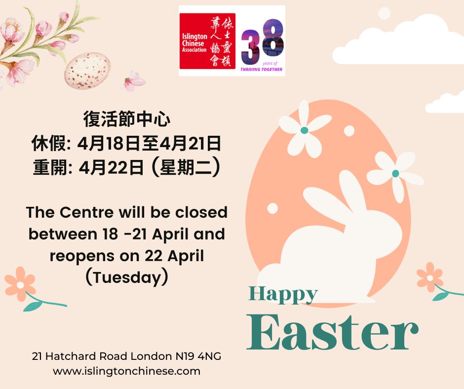 復活節期間(4月18日至4月21日)中心將會關閉, 4月22日 (星期二)重開. 預祝大家有一個愉快的復活節假期! The Centre will be closed between18 April – 21 April, and reopens on 22 April (Tuesday). Wishing you a Happy Easter holidays!
