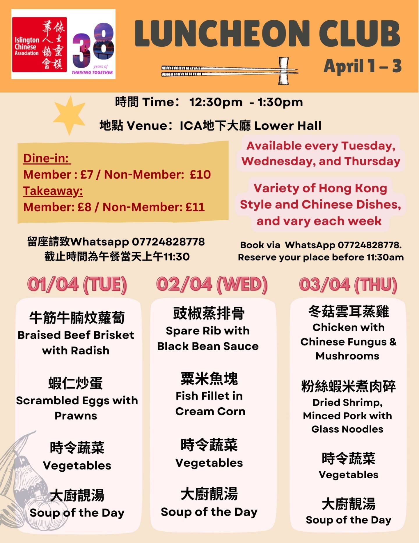 下星期菜單準備好了!當天上午11:30前記得 WhatsApp 07724 828778 留位啦 .
