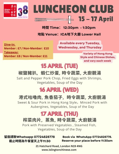 下星期菜單準備好了!當天上午11:30前記得 WhatsApp 07724 828778 留位啦 .