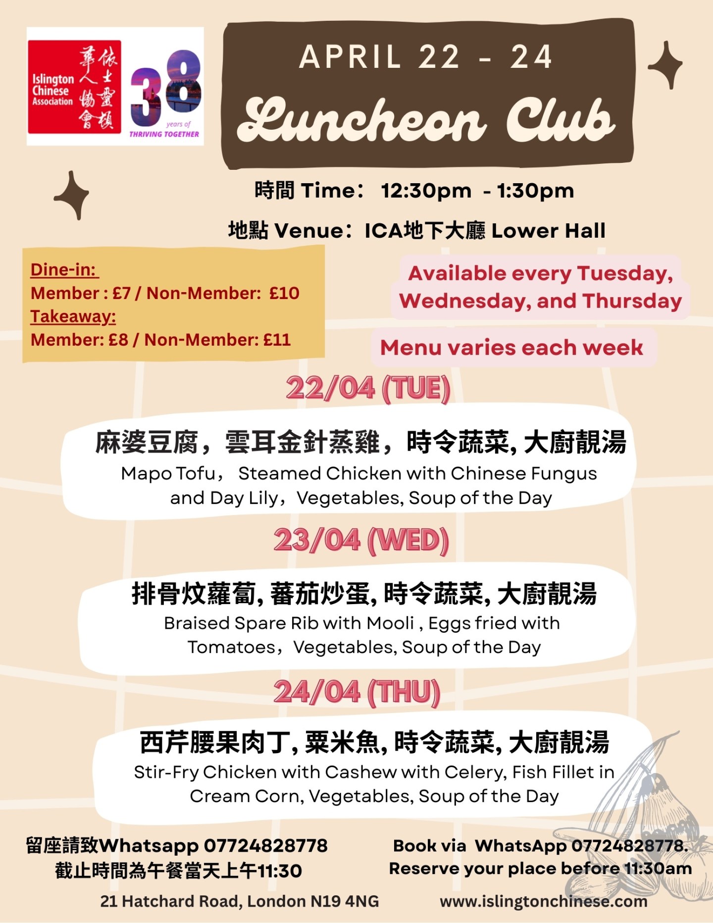 下星期菜單準備好了!當天上午11:30前記得 WhatsApp 07724 828778 留位啦 .