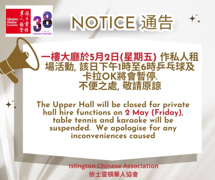 一樓大廳於5月2日(星期五) 作私人租場活動, 該日下午1時至6時乒乓球及卡拉OK將會暫停.不便之處, 敬請原諒 The Upper Hall will be closed for private hall hire functions on 2 May (Friday), table tennis and karaoke will be suspended. We apologise for any inconveniences caused.