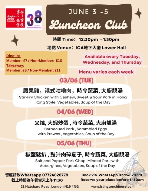 下星期菜單準備好了!當天上午11:30前記得 WhatsApp 07724 828778 留位啦 . The latest Lunch Menu is ready! Remember to WhatsApp 07724 828778 and reserve your seat before 11:30 am on the day.