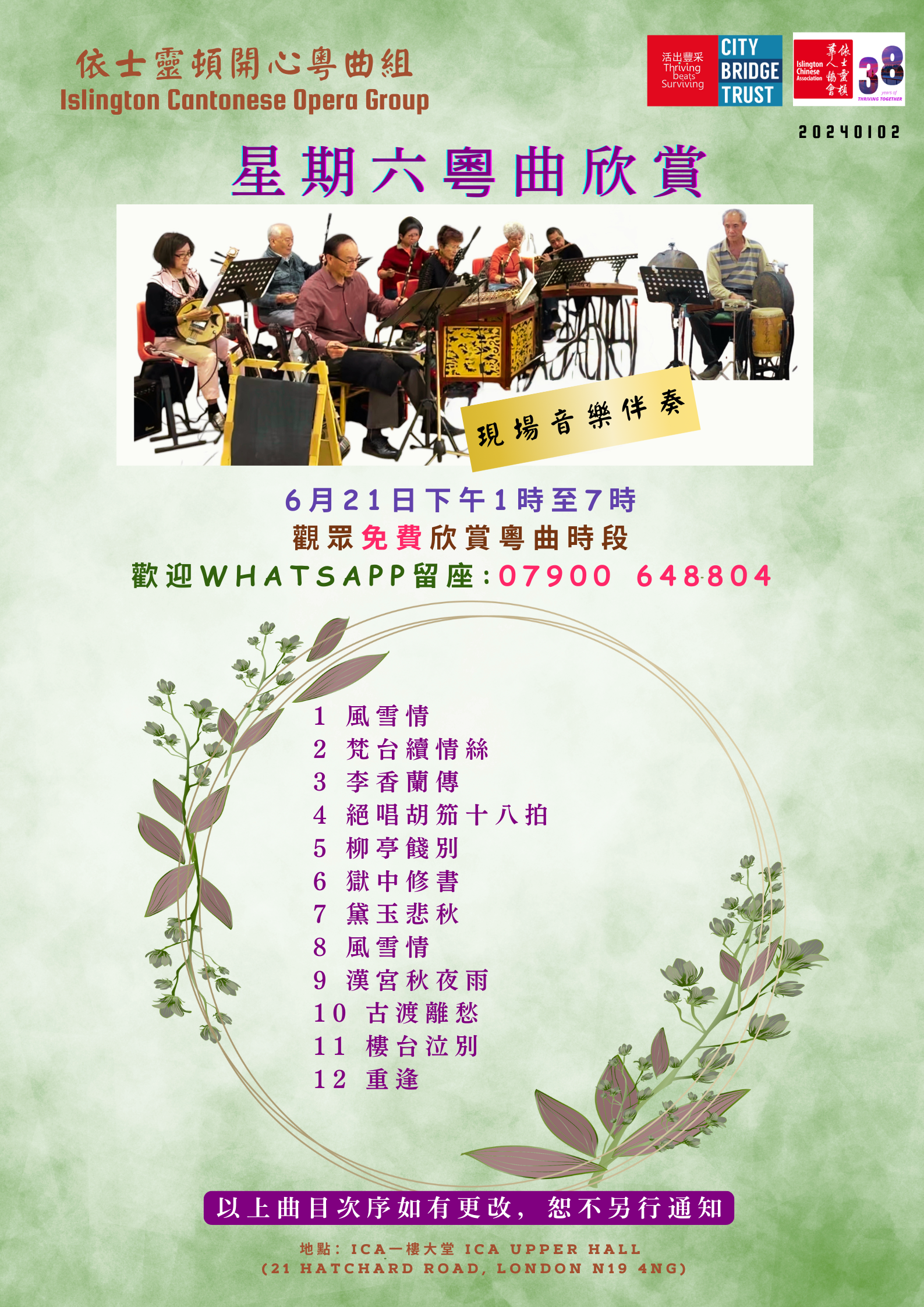 The Islington Cantonese Opera Group cordially invites those Cantonese operatic song’s lovers to come and join its free appreciation session with live music this Saturday, 21 June from 1:00 to 7:00 PM. For reservations, please WhatsApp 07900 648804. Venue: ICA Upper Hall (21 Hatchard Road, London N19 4NG). The sequence of Cantonese opera songs is as follows. Tracks or order may change without further notice. 🪕🪈🎤🎼🎼🎤🪈🪕