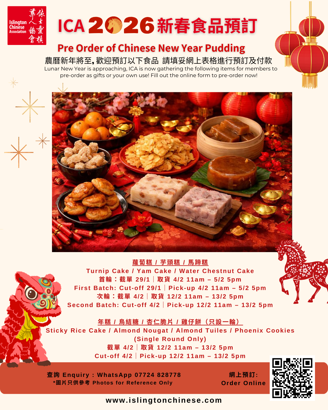 農曆新年將至,Islington Chinese Association 為大家準備多款傳統賀年糕點及小食,無論送禮或自用都一樣合適,與家人朋友一同分享新年的甜蜜與祝福!