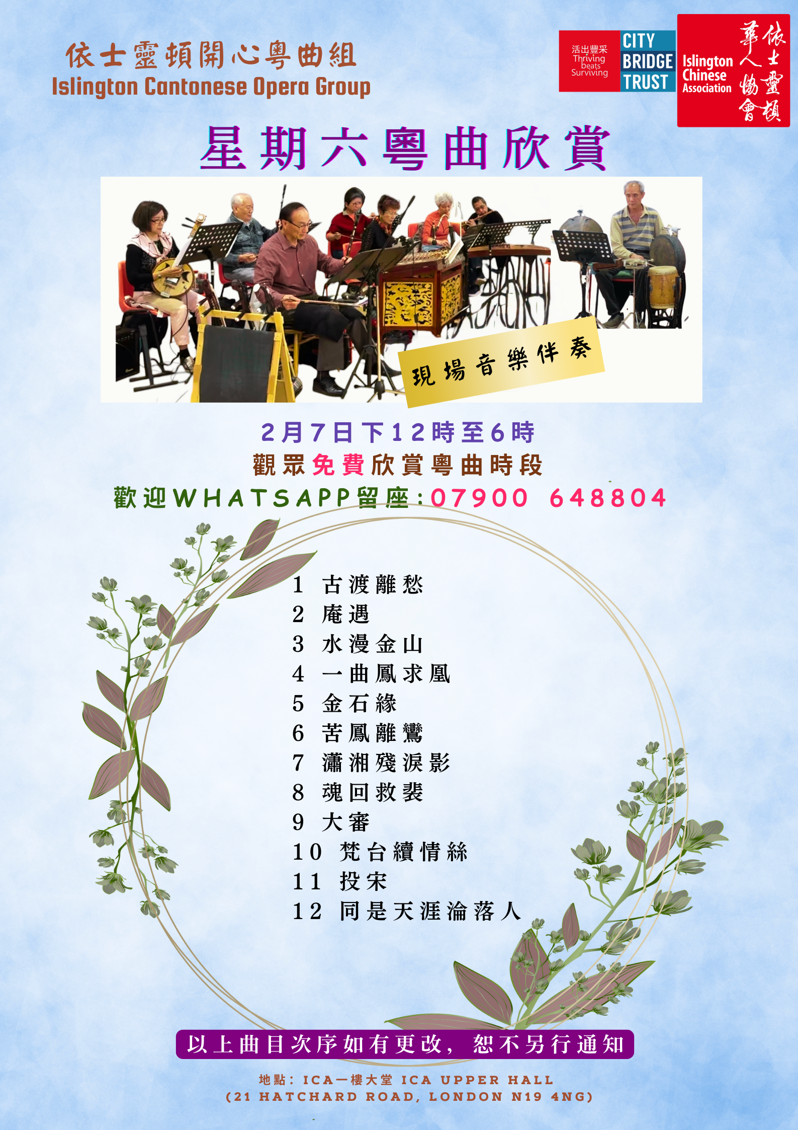 🎼 曲目次序如下(如有更改,恕不另行通知):