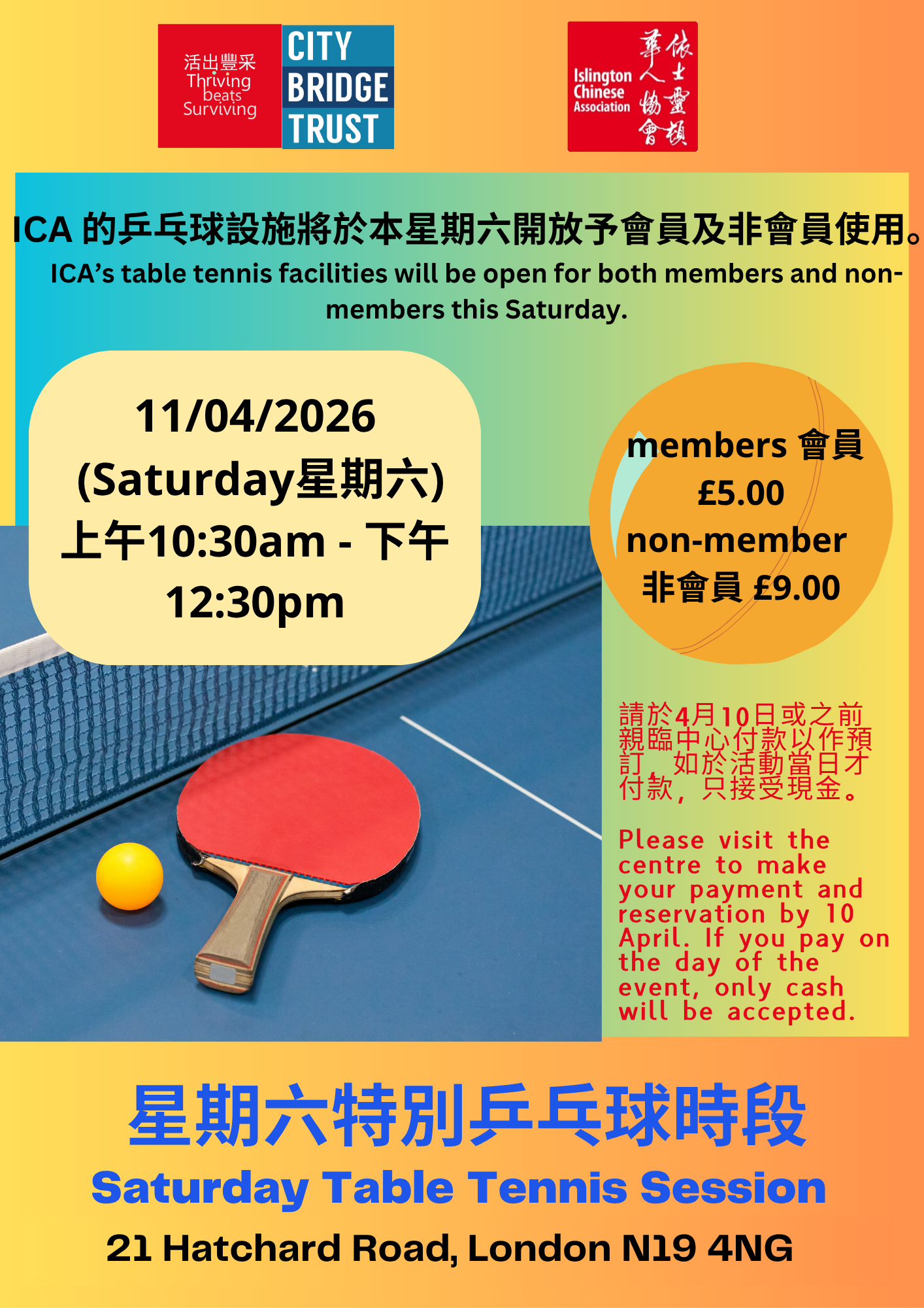 ICA’s table tennis facilities will be open this Saturday for both members and non-members.