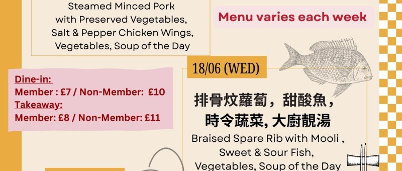 下星期菜單準備好了!當天上午11:30前記得 WhatsApp 07724 828778 留位啦 . The latest Lunch Menu is ready! Remember to WhatsApp 07724 828778 and reserve your seat before 11:30 am on the day. 10/06/2025 (星期二 Tue)日式照燒雞 Chicken with Teriyaki Sauce蕃茄炒蛋 Eggs fried with Tomatoes時令蔬菜 Vegetables大廚靚湯 Soup of the Day 11/06/2025 (星期三 Wed)香菇金針蒸雞 Chicken with Day Lily and Fungus魚香豆角 Stir-fry Green Bean…