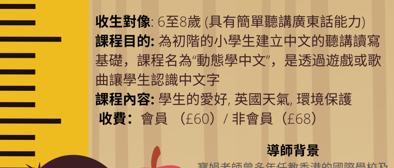 課程目的 : 為初階的小學生建立中文的聽講讀寫基礎,課程名為“動態學中文”,是透過遊戲或歌曲讓學生認識中文字 日期: 8月2日至月8月18日 (每週二和週四)時間: 下午2:00 to 3:30 (九十分鐘) 地點:本中心活動室 對像年齡: 6至8歲 (具有簡單聽講廣東話能力) (每班6人) 課程內容 : 英國天氣(介紹季節與衣服), 學生的愛好(例如: 偶像或書) , 環境保護 (介紹各種再生能源) 收費: 會員 (6堂60磅) / 非會員 (6堂68磅) 導師: 寶娟老師 (曾多年任教香港的國際學校及香港教育大學,具豐富教導香港非華語學生學習中文的經驗,為{漢字遊戲室}作者,寫作刊於英國華人月刊“號角”) 學歷: 教育博士(香港教育大學) 教育文憑“教授學習中文為外國語言”(倫敦大學亞非學院) 英國註册幼兒䕶士 Class Objectives : To establish the foundation of Chinese listening, speaking, reading and writing for elementary school students at…