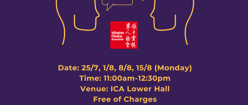 「衣食住行」基礎英語班 (Part 3) 英語班從英國衣食住行基本生活需要出發,目的讓學員更有信心以英語進行對答,處理日常大小事情,例如住宿、家庭/汽車維修、銀行、鄰居等,如何投訴或請求幫助等。課程定於2022年7月29日開課,逢星期五上午10:30-12:30舉行,共有4節,每節2小時。 日期 : 29/7,5/8,12/8,19/8 (逢週五) 時間 : 上午10:30 - 中午12:30 地點 : ICA Upper Hall 學費: £12 (非ICA會員£20) 報名 : 02072635986 (Tel)/ 7724828778 (Whatsapp) English Class for Beginners (Part 3) ICA will offer an English course for beginners from 29 July 2022. As part of ICA’s Welcome Hongkongers’ Programme, the course…