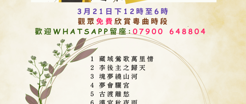 📢 粵曲欣賞免費活動|依士靈頓開心粵曲組 🎭 日期:2026年3月21日(星期六)🕛 時間:中午12:00 至 下午6:00📍 地點:ICA 上層禮堂(Upper Hall) 21 Hatchard Road, London N19 4NG 🎶 現場樂隊伴奏,觀眾免費入場欣賞!依士靈頓開心粵曲組誠邀喜愛粵曲的你前來觀賞! 📲 留座請 WhatsApp:07900 648804 🪕🪈🎤🎼🎼🎤🪈🪕 🎼 曲目次序如下(如有更改,恕不另行通知): 1 藏域鶯歌萬里情2 李後主之歸天3 魂夢繞山河4 夢會驪宮5 古渡離愁6 漢宮秋夜雨7 瀟湘殘淚影8 葬花9 古渡離愁10 梵台續情絲11 魂回救裴12 狄青闖三關之猜心事 📢 Free Cantonese Opera Appreciation Event|Islington Happy Cantonese Opera Group 🎭 Date: Saturday, 21 March 2026🕛 Time: 12:00…