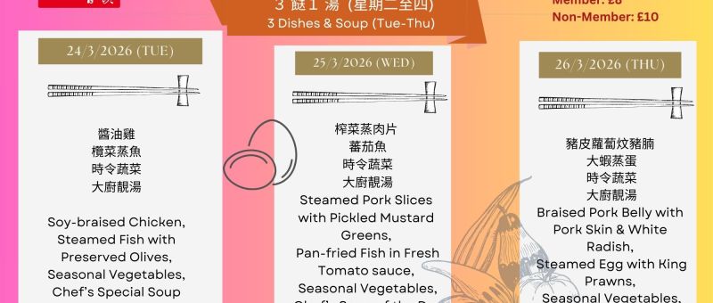 ICA LUNCHEON CLUB 2026 逢星期二、星期三及星期四供應Available every Tuesday, Wednesday & Thursday 📅 下週午餐菜單 Lunch Menu 記得於 當天上午11:30前 WhatsApp 07724 828778 預留位置 😋😋😋Please WhatsApp 07724 828778 before 11:30 am on the day to reserve your seat 😋😋😋 📌 星期二 (24/3) 醬油雞欖菜蒸魚時令蔬菜大廚靚湯 Soy-braised ChickenSteamed Fish with Preserved OlivesSeasonal VegetablesChef’s Special Soup 📌 星期三 (25/3) 榨菜蒸肉片蕃茄魚時令蔬菜大廚靚湯 Steamed Sliced Pork…