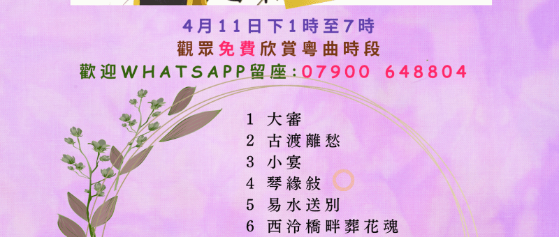📢 粵曲欣賞免費活動|依士靈頓開心粵曲組 🎭 日期:2026年4月11日(星期六)🕐 時間:下午1:00 至 7:00📍 地點:ICA 上層禮堂(Upper Hall) 21 Hatchard Road, London N19 4NG 🎶 現場樂隊伴奏,觀眾免費入場欣賞!依士靈頓開心粵曲組誠邀喜愛粵曲的你前來觀賞! 📲 留座請 WhatsApp:07900 648804 🪕🪈🎤🎼🎼🎤🪈🪕 🎼 曲目次序如下(如有更改,恕不另行通知): 1 大審2 古渡離愁3 小宴4 琴緣敍5 易水送別6 西泠橋畔葬花魂7 武則天與王皇后8 大審9 胭脂巷口故人來10 魂回救裴11 花田錯會12 良朋 📢 Free Cantonese Opera Appreciation Event|Islington Happy Cantonese Opera Group 🎭 Date: Saturday, 11 April 2026🕐 Time: 1:00…