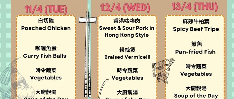 新一期菜單上場啦!當天上午11:30前記得 WhatsApp 07724 828778 留位啦! The latest Lunch Menu is ready! Remember to WhatsApp 07724 828778 and reserve your seat before 11:30 am on the day. 11/04/2023(星期二Tue) 白切雞 Poached Chicken 咖喱魚蛋 Curry Fish Balls 時令蔬菜 Vegetables 大廚靚湯 Soup of the Day 12/04/2023(星期三Wed) 香港咕嚕肉 Sweet & Sour Pork in Hong Kong Style 粉絲煲 Braised Vermicelli 時令蔬菜 Vegetables…