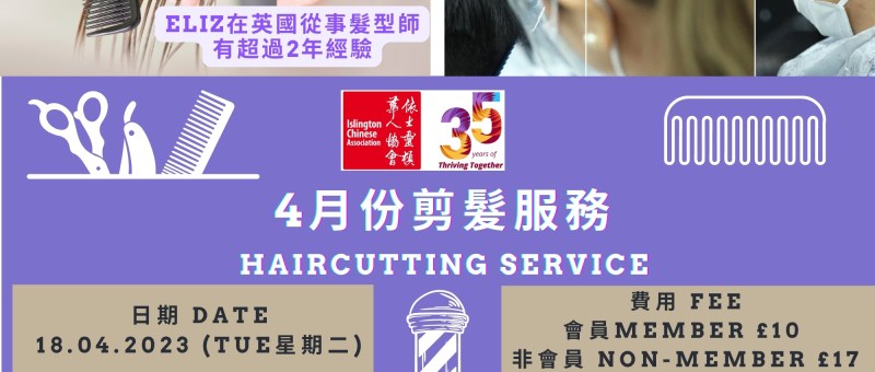 4月份剪髮服務又來啦! 來自香港的髮型師 Eliz 於4月18日(星期二)在中心為會員剪髮,Eliz在香港和英國從事髮型師工作2年多。當天剪髮服務由早上10時至下午5時30分 (最後預訂時間為下午5時) , 名額15個,會員£10,非會員£17。 請Whatsapp 07724828778 預約 ,先到先得,額滿為止。 Haircutting Service is available on 18 April (Tue) from 10:00 to 17:30 (last booking is at 17:00) by the experienced hair stylist, Eliz. She has over 2 years’ experiences of hairstyling in Hong Kong and the UK. Only 15 quotas are available. Hair-cutting fee…