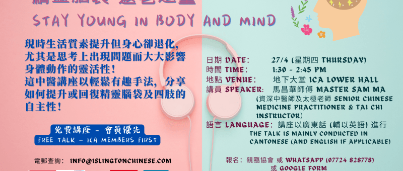 中醫養生講座 – 精靈腦袋 返老還童 (免費講座 – 會員優先) TCM Health Talk – Stay Young in Body and Mind (Free Talk – ICA Members First)