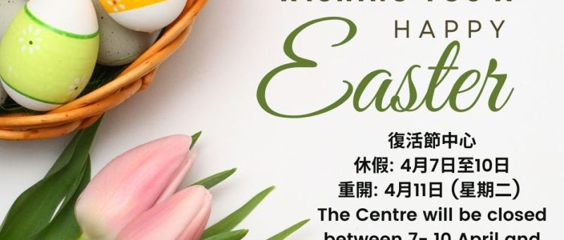 復活節將至,中心於4月7日至10日休假。4月11日 (星期二) 重開!預祝大家有個愉快的復活節假期! The Centre will be closed between 7- 10 April during Easter Holidays and reopens on 11 April (Tuesday). Wishing you a lovely Easter holidays!