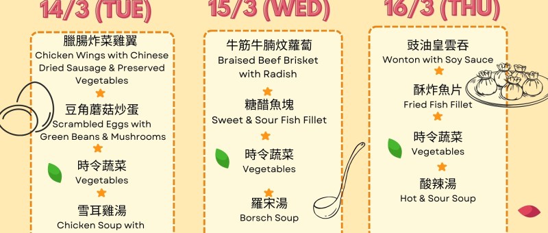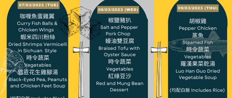 07/03/2023 (星期二Tue) 咖喱魚蛋雞翼 Curry Fish Balls & Chicken Wings 蝦米四川粉絲Dry Shrimps Vermicelli in Sichuan Style 時令蔬菜 Vegetables 眉豆花生雞腳湯 Black-Eyed Pea, Peanuts and Chicken Feet Soup 08/03/2023(星期三Wed) 椒鹽豬扒Salt and Pepper Pork Chop 蠔油雙豆腐Braised Tofu with Oyster Sauce 時令蔬菜Vegetables 紅綠豆沙Red and Mung Bean Dessert 09/03/2023 (星期四Thu) 胡椒雞Pepper Chicken 蒸魚Steamed Fish 時令蔬菜Vegetables 羅漢果菜乾湯Luo Han Guo Dried Vegetable Soup