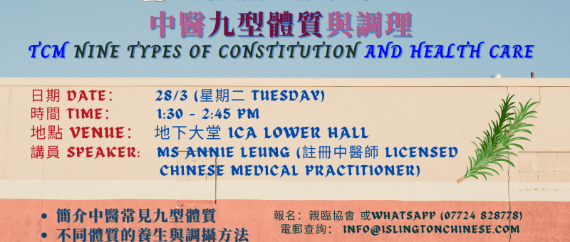 ICA健康知多點 – 中醫九型體質與調理 (免費講座- 會員優先) ICA Health Series – TCM Nine Types of Constitution and Health Care (Free Talk– ICA Members First)